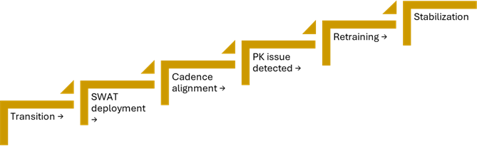 Through early SWAT support and experienced CRAs, the inherited backlog was cleared quickly, allowing the trial to resume normal cadence. Early anomaly detection and rapid retraining prevented loss of critical PK samples at a moment when the study depended on them most.